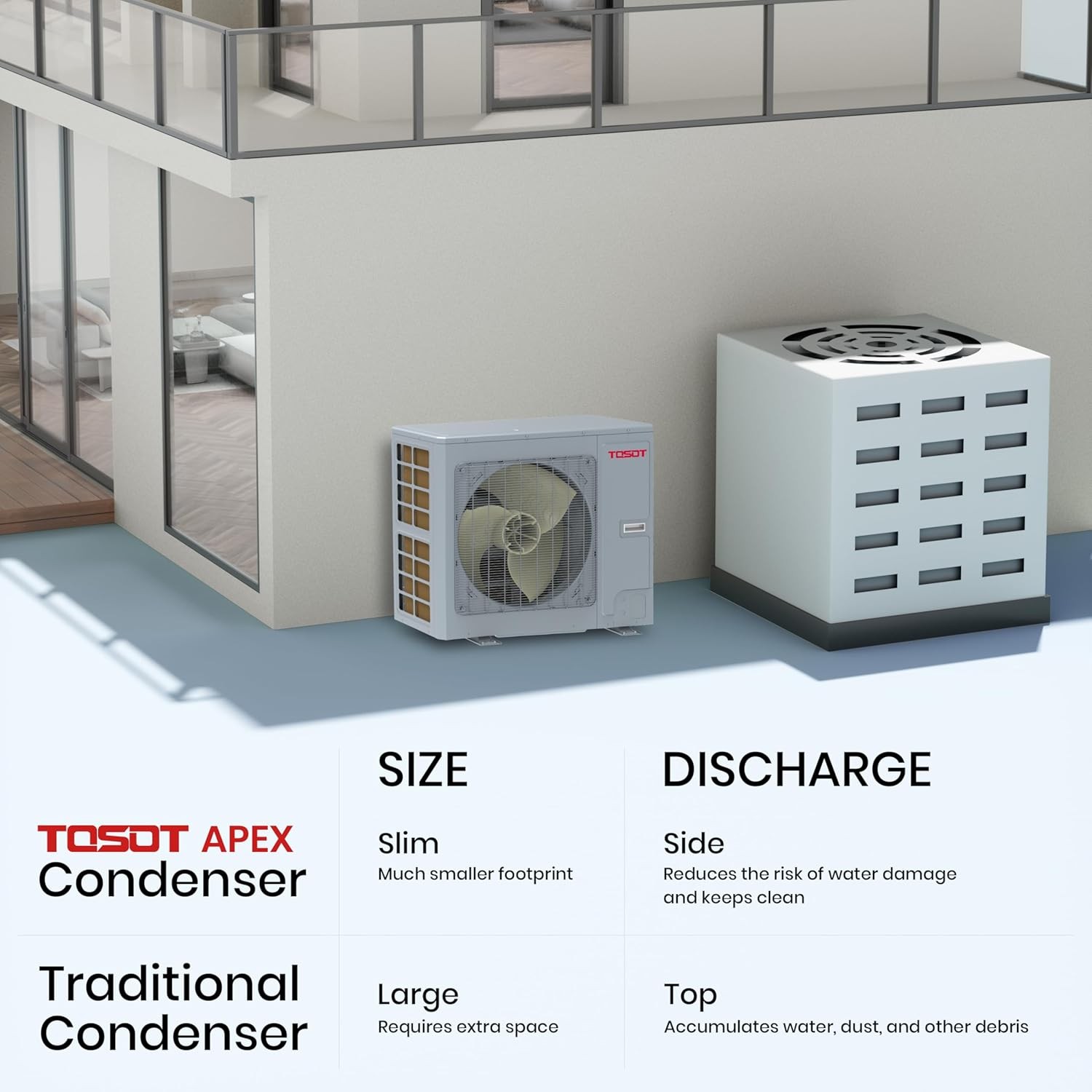 • Upgraded Condenser: The slim design takes up half the space of a gas furnace, fitting well in constricted areas like balconies or narrow side yards; side discharge design minimizes debris accumulation such as leaves and keeps noise levels below 58 dB