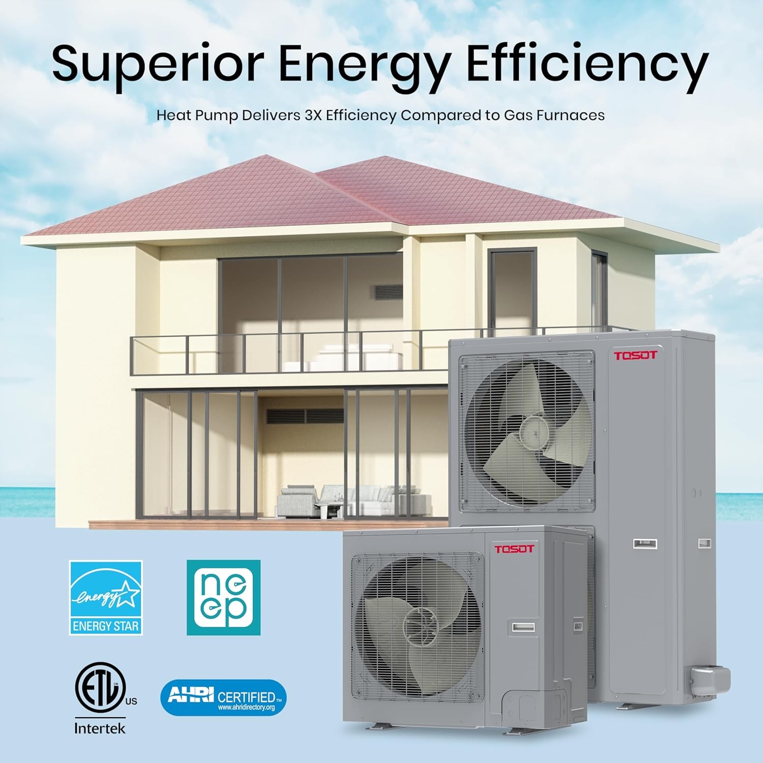 • UltraCool & UltraHeat Technology: Unlike traditional gas furnaces that only offer heating, TOSOT APEX heat pump split air conditioner heats and cools efficiently in extreme conditions from -22℉ to 130℉, whether in hot states like Arizona or cold states like Michigan