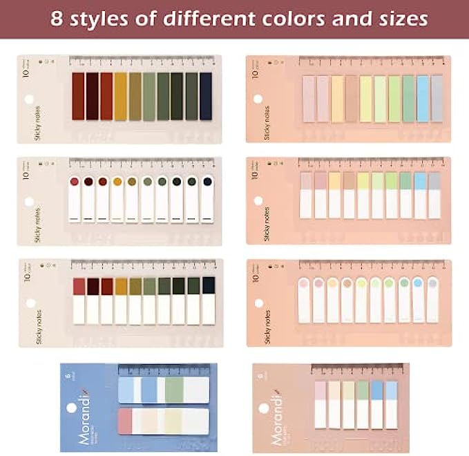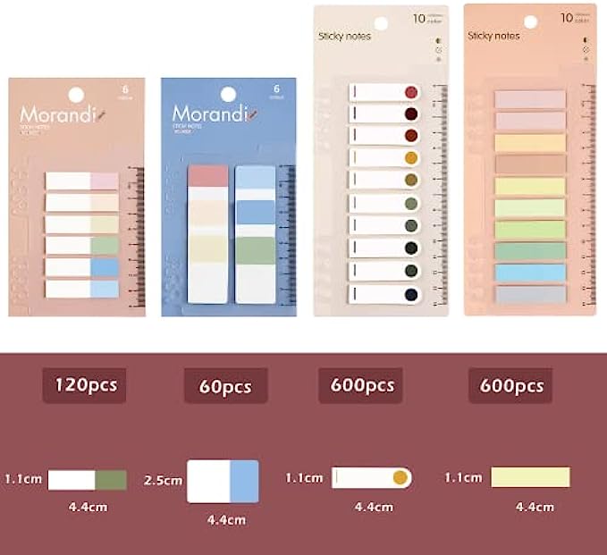 [Package ]: Each pack come with 1200 pcs morandi color in 10 colors rectangle(4.4 x 1.2 cm) 120 pcs in 6 colors rectangle(4.4 x 1.2 cm)and 60 pcs in 6 colors rectangle(4.4 x 2.5cm) page markers , total 8 sets ,1380pcs.