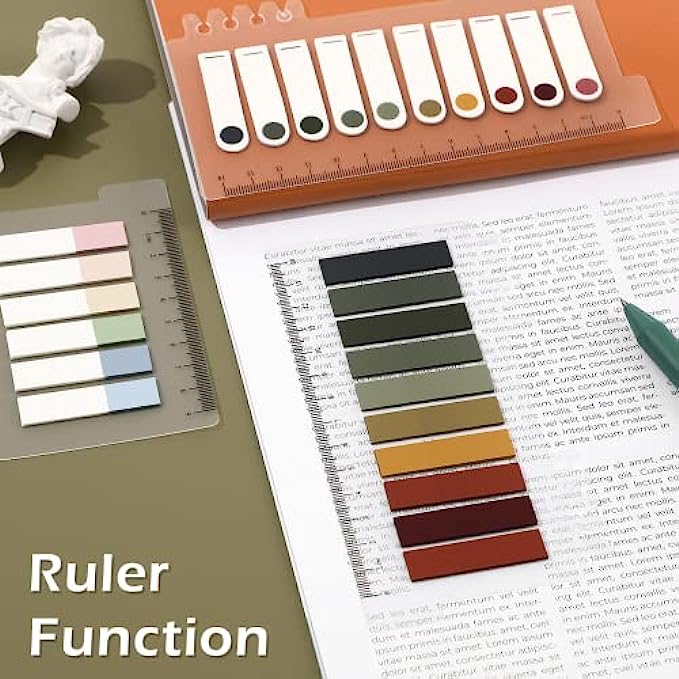 [Index Tabs with Ruler]: Notes flags with ruler , the ruler is soft and not easy to break. The ruler can be clamped on the notebook, and you can use it for measurement activities as needed.