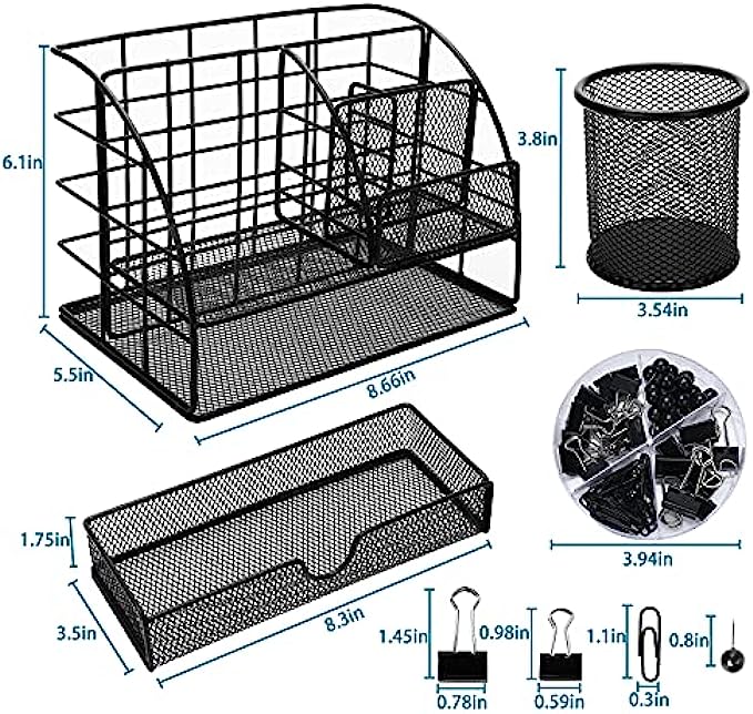 ✏️Desk Organizers and Accessories Set: (8.8 x 5 x 5 inches) The desk supplies organizer includes 6 compartments (5 widgets+1 large drawer) along with 1 pencil holder and 72 desktop accessories (7 large binders+15 small binders+20 pins+30 paper clips) for sorting and storage.