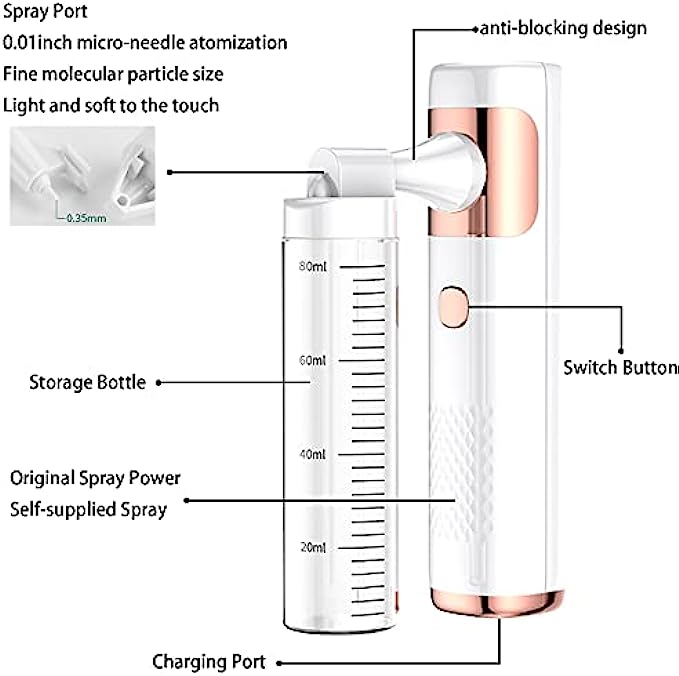 [Important Note] Do not put the nano spray upside down during use to prevent the liquid from leaking out through the air holes at the nozzle.After use, please discard the remaining liquid and clean the equipment. If you have any questions, you can contact us and we will give you the best service.