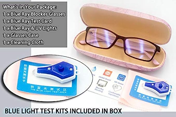 • ✅ ANTI BLUE LIGHT GLASSES WITH CASE & BLUE LIGHT BLOCKING TEST KITS ★ What's In Package: 1x Blue Light Blocking Glasses, 1x Blue & UV Led Light & Tester, 1x Glasses Case, 1x Cleaning Cloth. BUY WITH CONFIDENCE, TEST BLUE LIGHT GLASSES BY YOURSELF! Comfortable Visual Experience: Get The Difference Feel By The End Of The Day