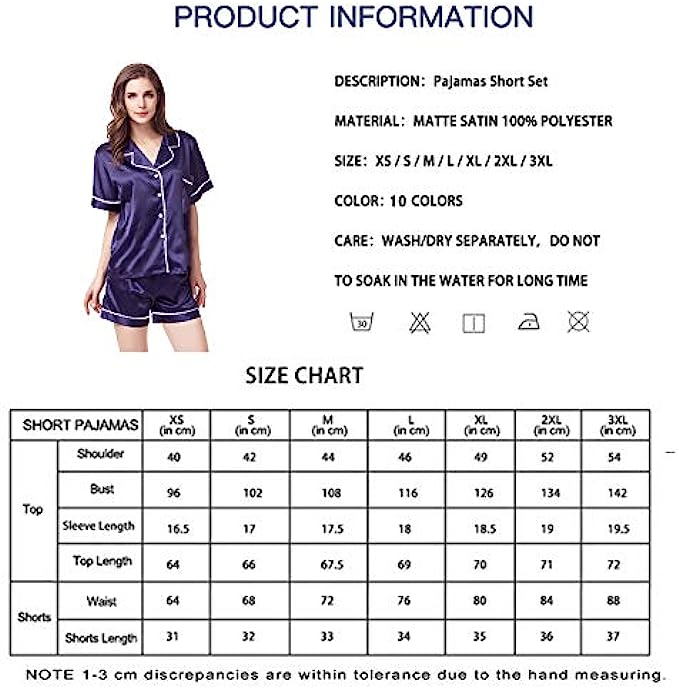 98% Polyester, 2% Other Fibers Button closure Hand Wash Only Material: Pajama set using premium 98% polyester, 2% spandex and plain matte satin material, feel very soft and silky, breathable, skin-friendly, so you have a restful sleep. Product Features: Loose fit, comfortable pajamas two-piece set Loose fit, comfortable two-piece pajama pajamas set with the silkiest elastic waist pants, elegant collar design, chest pockets, and flared buttons with contrast lace piping. The pajama set is soft and elegant, giving you a lazy sleep. Applicable Occasions: Women's short-sleeved silk satin pajama set, suitable for daily wear and easy to match. Light weight and easy to carry. Comfortable, suitable for rest and sleep, slumber party, girls' day, bridal pajamas, indoor, living room, bedroom, hotel, workplace, travel, daily pajamas. Cleaning instructions: The pajamas set is soft, not prevent the surface of the wrinkles affect the beauty, hand wash separately in cold water is recommended. Cool ironing on reverse side. Do not spin dry! Gift: Women's plain matte satin pajamas are made of high quality fabric with nice lace, soft and natural with luster. Perfect for your wife, girlfriend, mother, sister and daughter as a birthday gift, as well as for New Year, Valentine's Day, Christmas, bridal party gifts, honeymoon holidays or other holidays or anniversaries.
