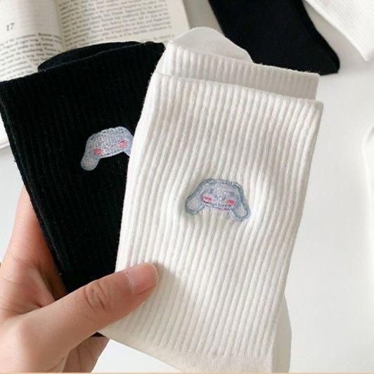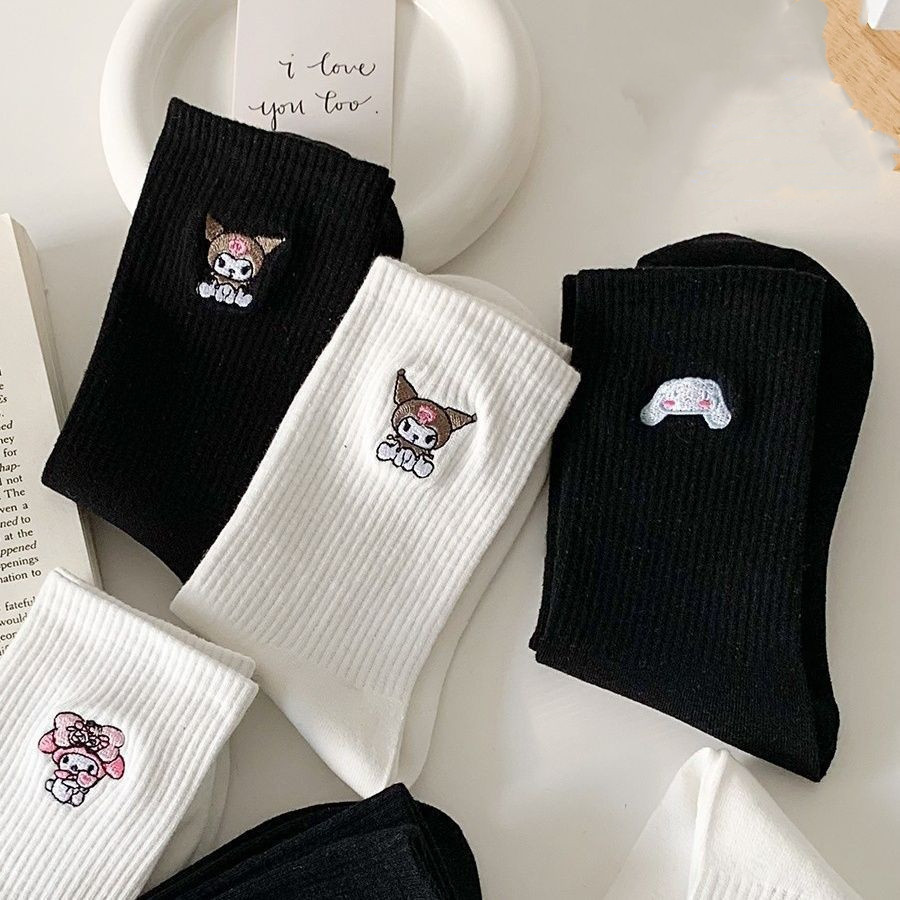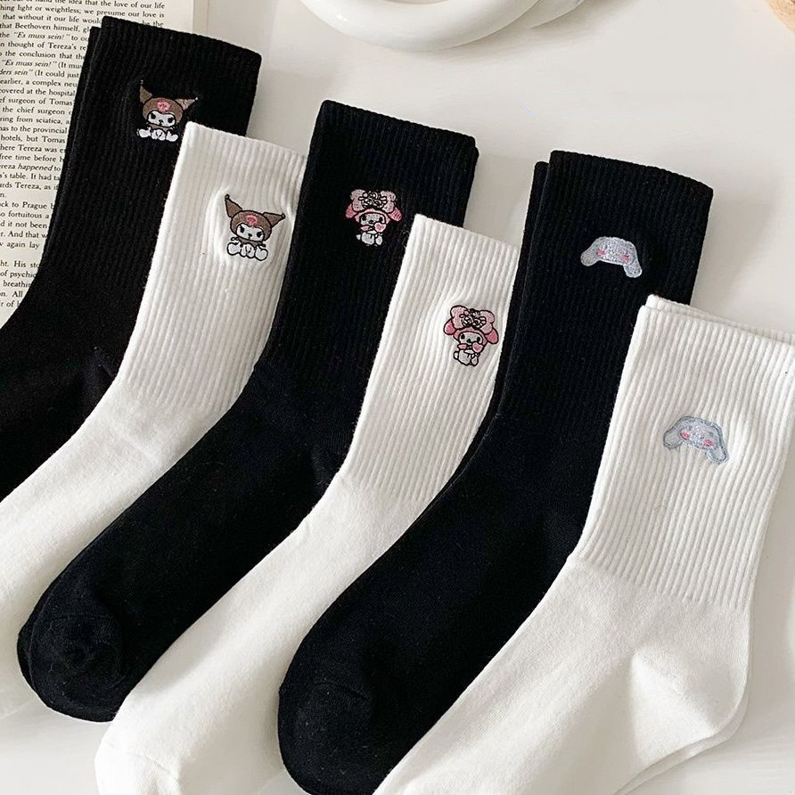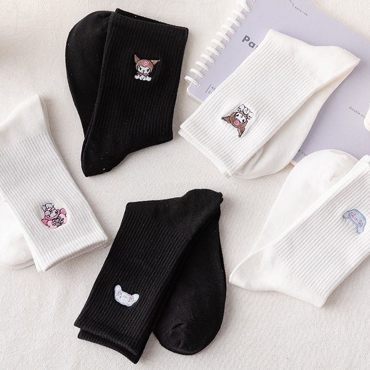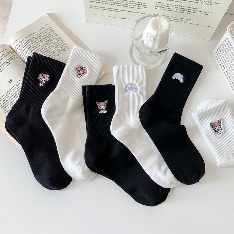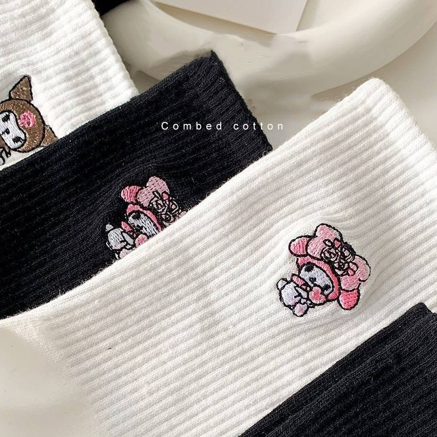 Material Quality:socks Colour:black my melody looks like my nightmare but from afar it doesnt look half as bad considering the price as its very cute and affordable. noone would think to give my nightmare a second look ☺☺ 7/10 -minus points for the nightmareish look