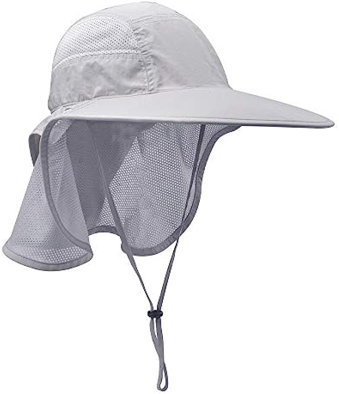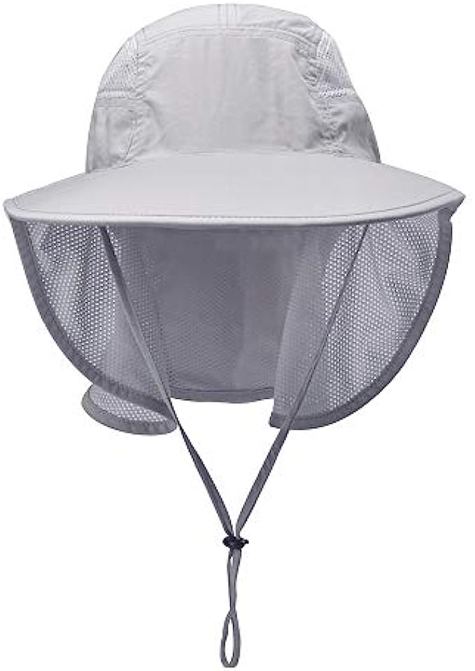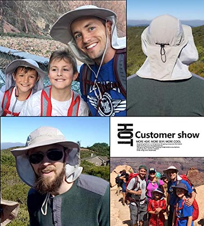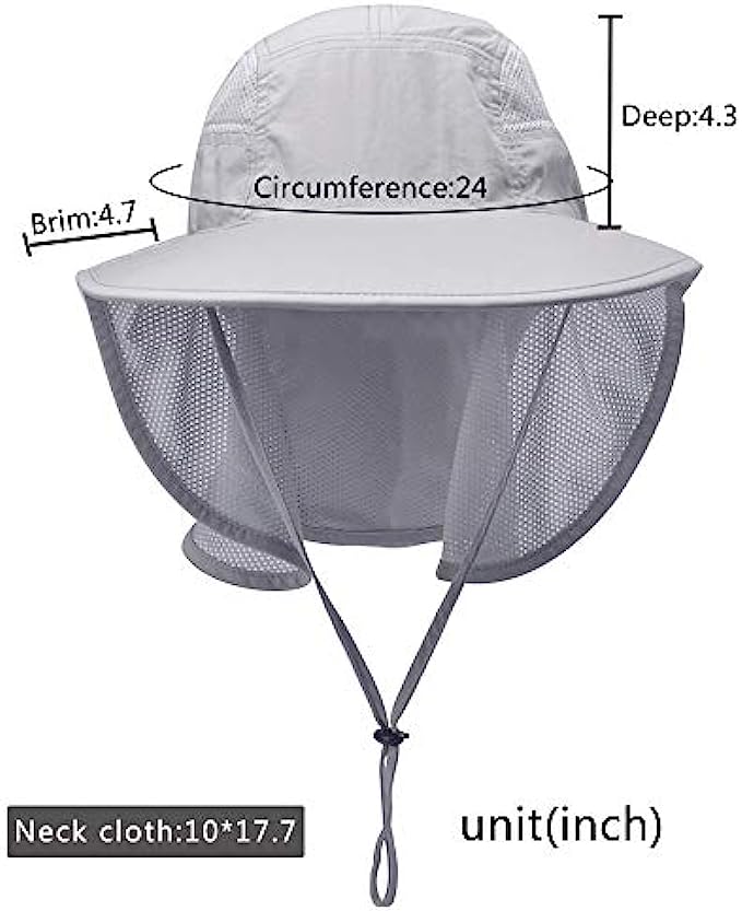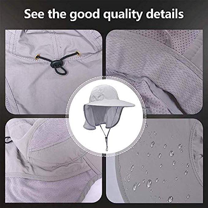 100% Polyester  Drawstring closure Full Protection: features 50+ UPF fabric which block 98% of UV rays. This flap hats will protect your ears, neck and the back of your head from the scorching summer sun. Light Wearing: made of quality polyester which is lightweight, quick-drying, foldable, water and stain resistant. Breathable Mesh: the mesh side panels allow ventilation which makes your head breathable in sunny with strong sunshine. One Fits All: adjustable back band (22-24inches) and chin strap provide a comfortable fit and keep your hat from being blown away on windy days. FUNctional: whether you are out walking, hiking, fishing, playing golf, gardening, sightseeing, on the beach, at a ball game or working outdoors, this hat has you covered.