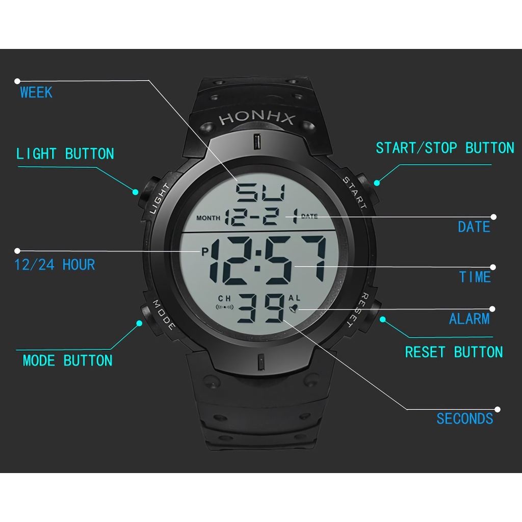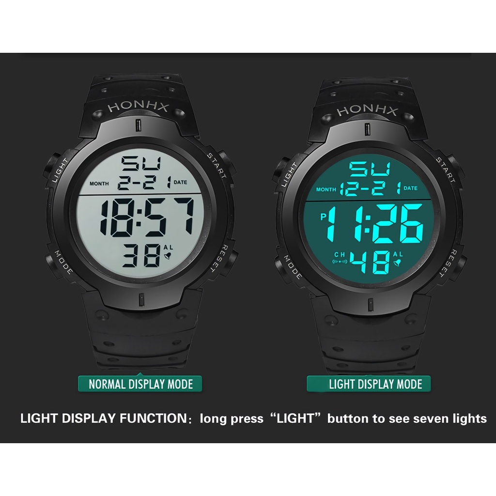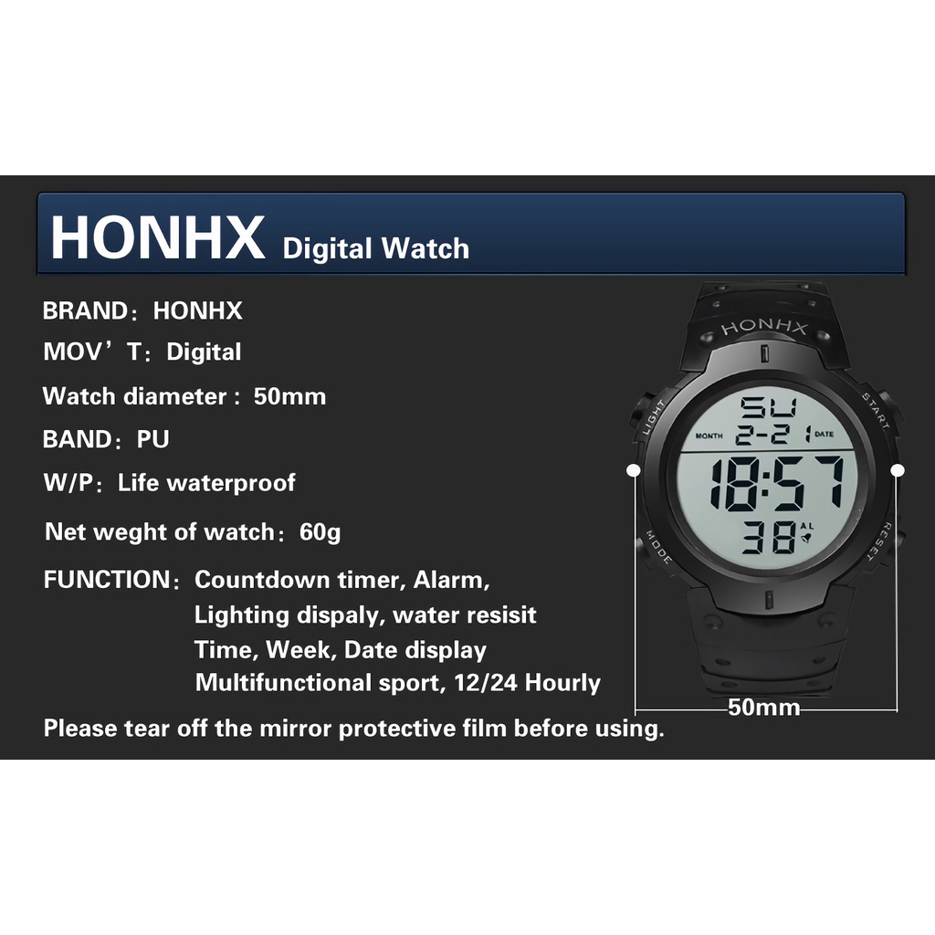 Colour:black with green light Material Quality:looks strong It has stop watch function and alarm. It comes with instruction manual to teach on how to use the different functions. Good for sports because it is water resistant, so it can withstand perspiration. The mode button is very sensitive so it switches to other modes easily.