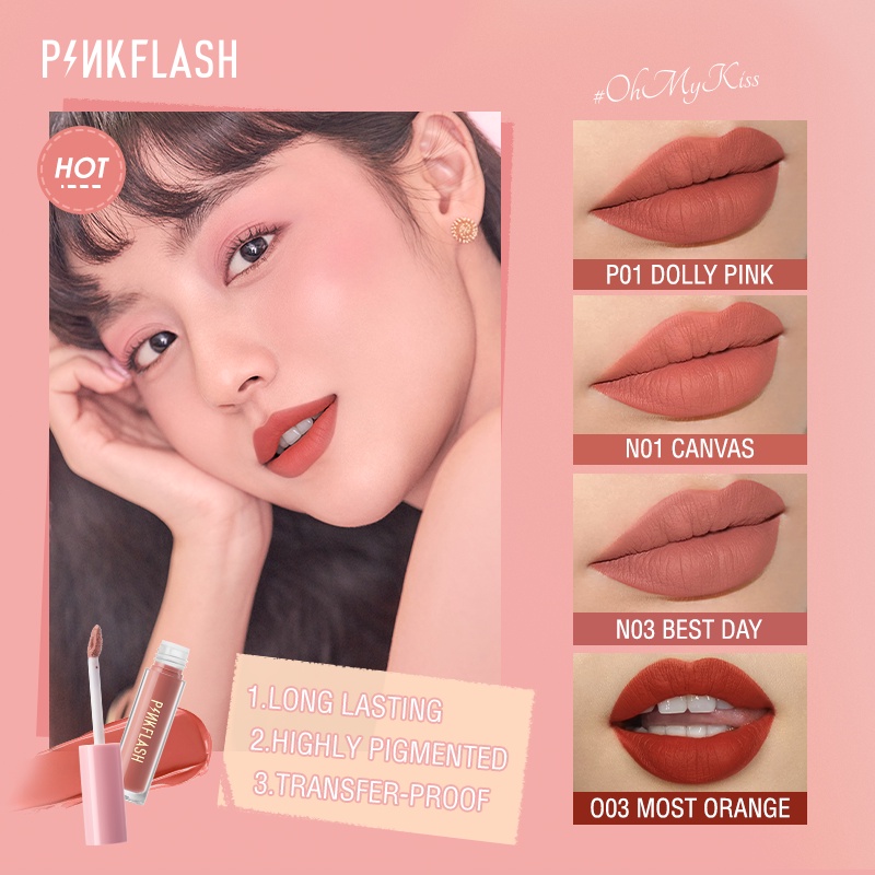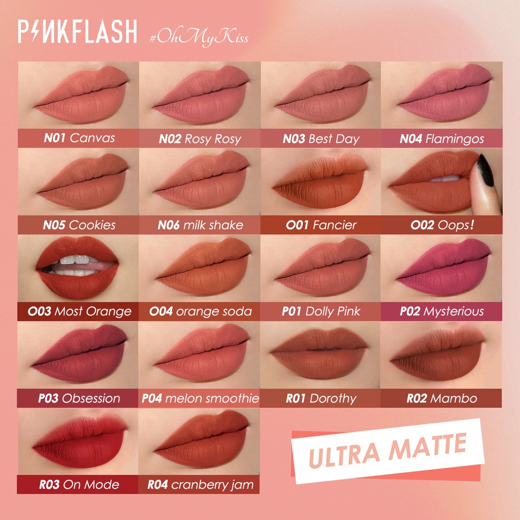 swatches: middle 2 are obsession and dorothy. (top & bottom are not pinkflash products) absolute LOVE! smudgeproof matte lipsticks. airy and comfortable on the lips!!! I'm quite tan, on my lips are dorothy, which is pinkish with a coral pull on me. perfect daily lip colour.