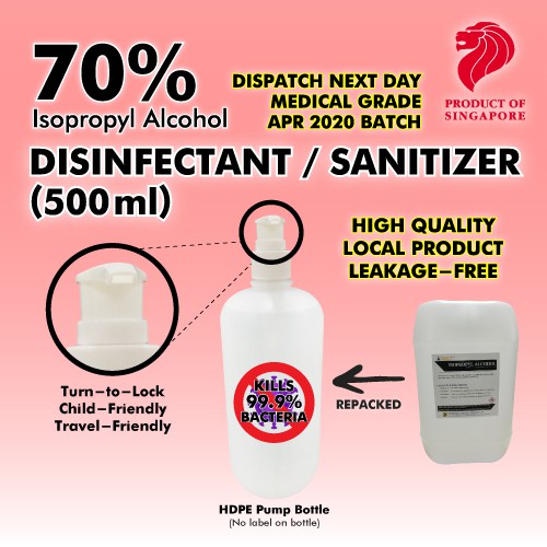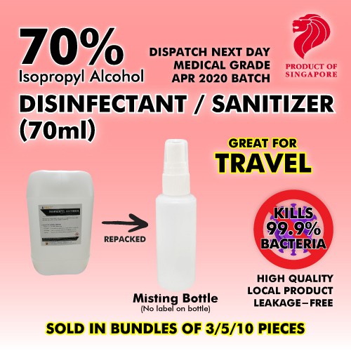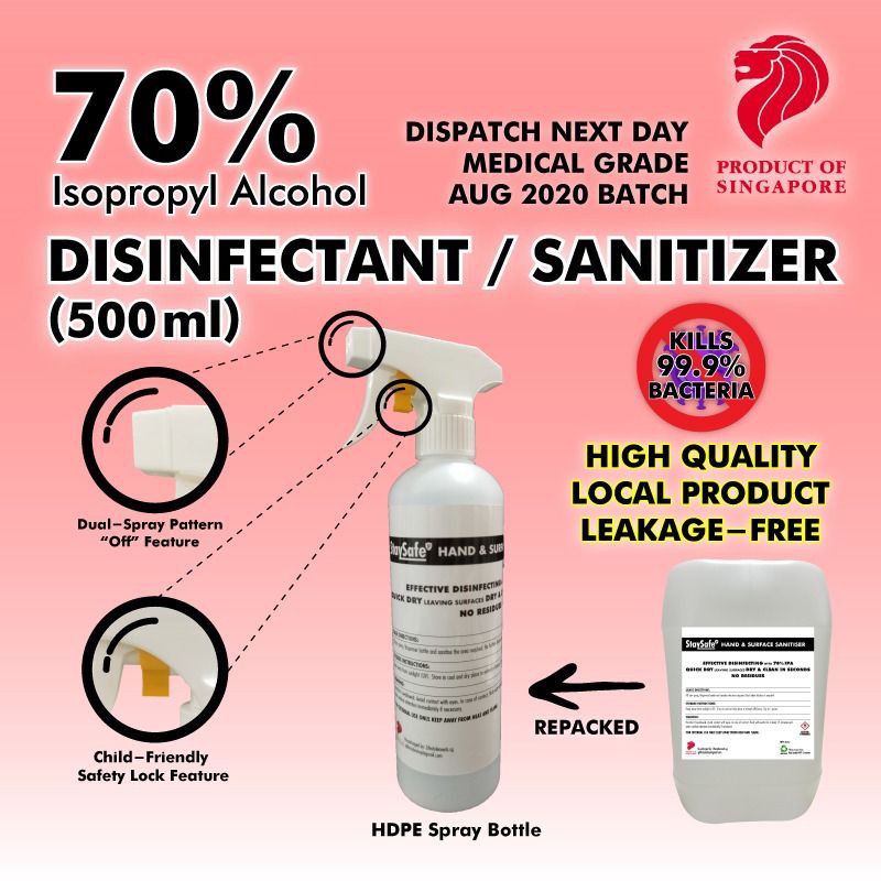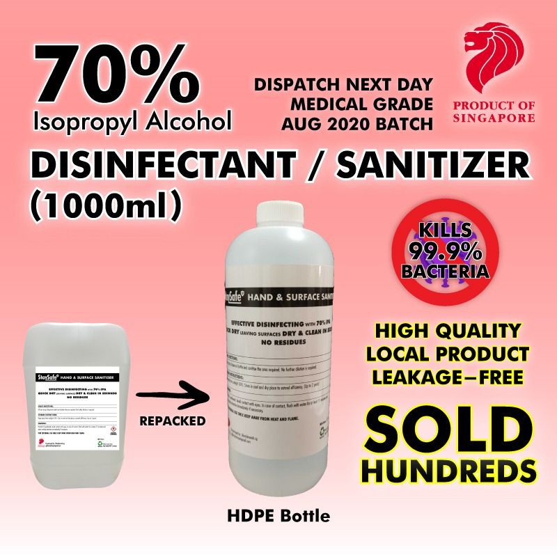 -- Hand Sanitizer 70% Isopropyl Alcohol Based (Hospital Grade) --- Sizes Available- -5Litres (Final few batches!) -1Litres (Directly from 25litres drum, not diluted from concentrate) NO sticky residues unlike other foamy types of hand sanitizer. Direction of usage: - Simply transfer it into a spray container. 100% safe to use on skin & also be used on surfaces eg. Tables, Trolley handles, toilet seats, in ear thermometer capp and oral thermometer. !
