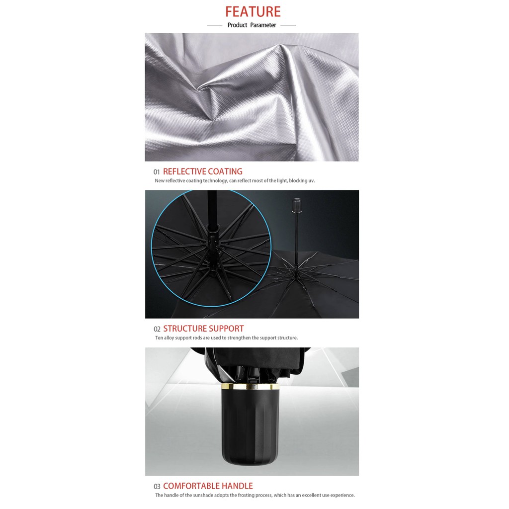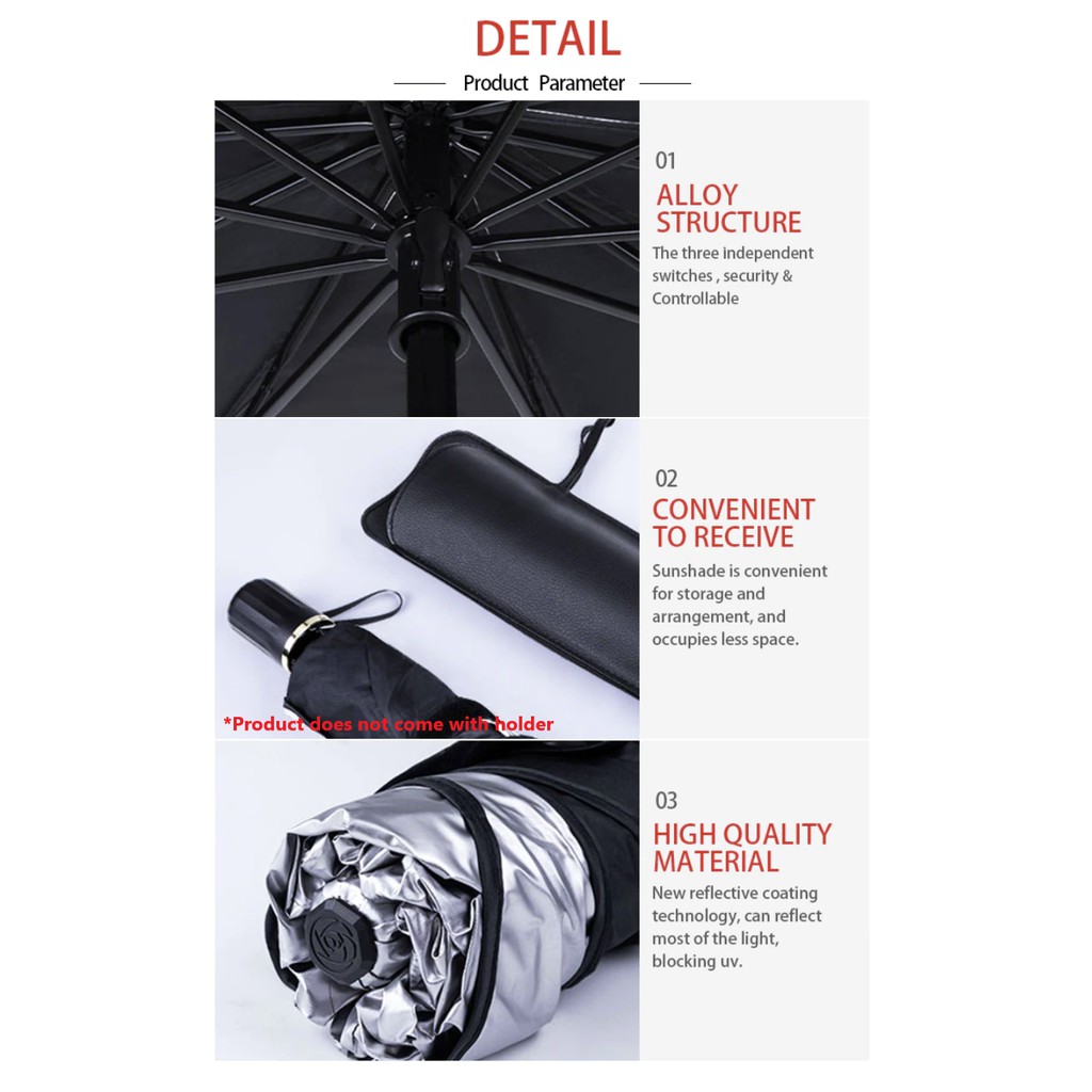 Suitability:Looks & operate like an umbrella. Appearance:Very nice colour: black & metallic silver Quality:Good This is an innovative product that meets the needs of every driver in terms of very quick deployment of sunshade and easy closing of sunshade. In emergency can function as an umbrella for two persons walking side by side under the hot sun. Coming with a long velcro that can be useful.